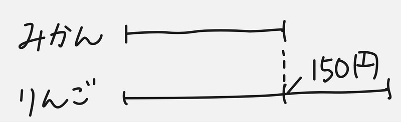 りんご1個の値段を\(x\)円とすると、みかん1個の値段は\((x-150)\)円となる。