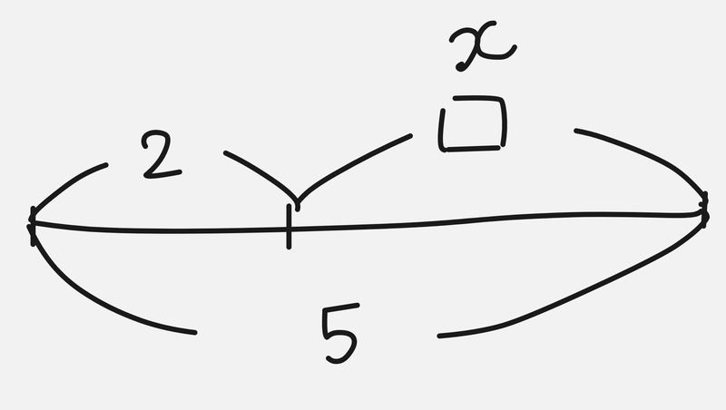 もちろん、式は \(2 + \square = 5 \) となりますが、これを次のように読み取る(解釈する)習慣をつけたいものです。