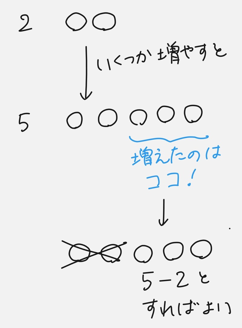 ここで、たし算は「2組のものを合わせて数える」「増やすことを表す」ときに使う計算であることを知っていれば、「2からいくら増やせば5になりるか?」と考えると、3とわかります。
